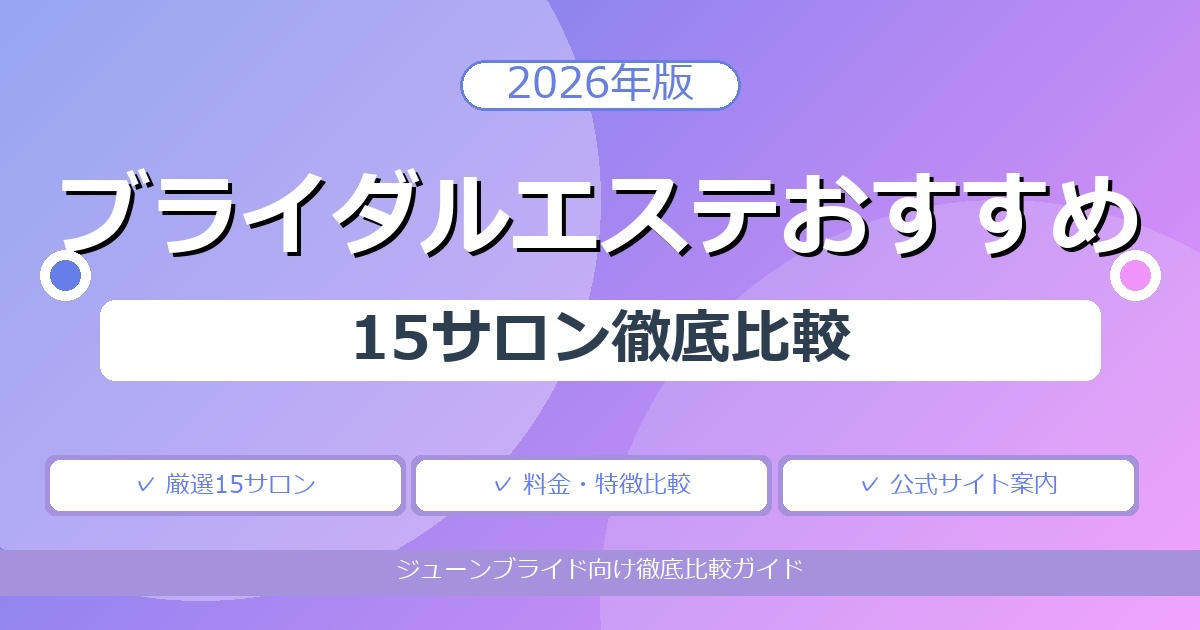 2026年6月のジューンブライドを目前に「ブライダルエステはどこに通えばいい?」と悩む花嫁さんへ。専門店から大手チェーン、医療連携メディカル系、痩身特化型まで、それぞれ強みが違うブライダルエステサロンを15店、特徴・料金目安・主要メニュー・おすすめ対象別に整理しました。